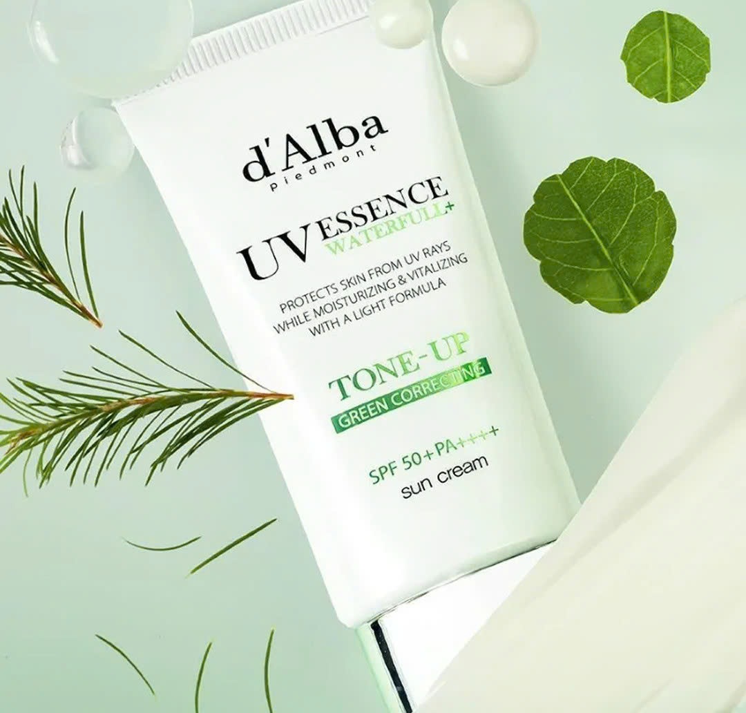 Kem chống nắng nâng tone, dịu da d'Alba Waterfull Tone Up Green Correcting Sun Cream SPF50+ PA++++ là phiên bản mới xanh lá tone up vừa nâng tone, giảm đỏ dịu da, hiệu chỉnh sắc tố da dễ đỏ, dễ kích ứng.
