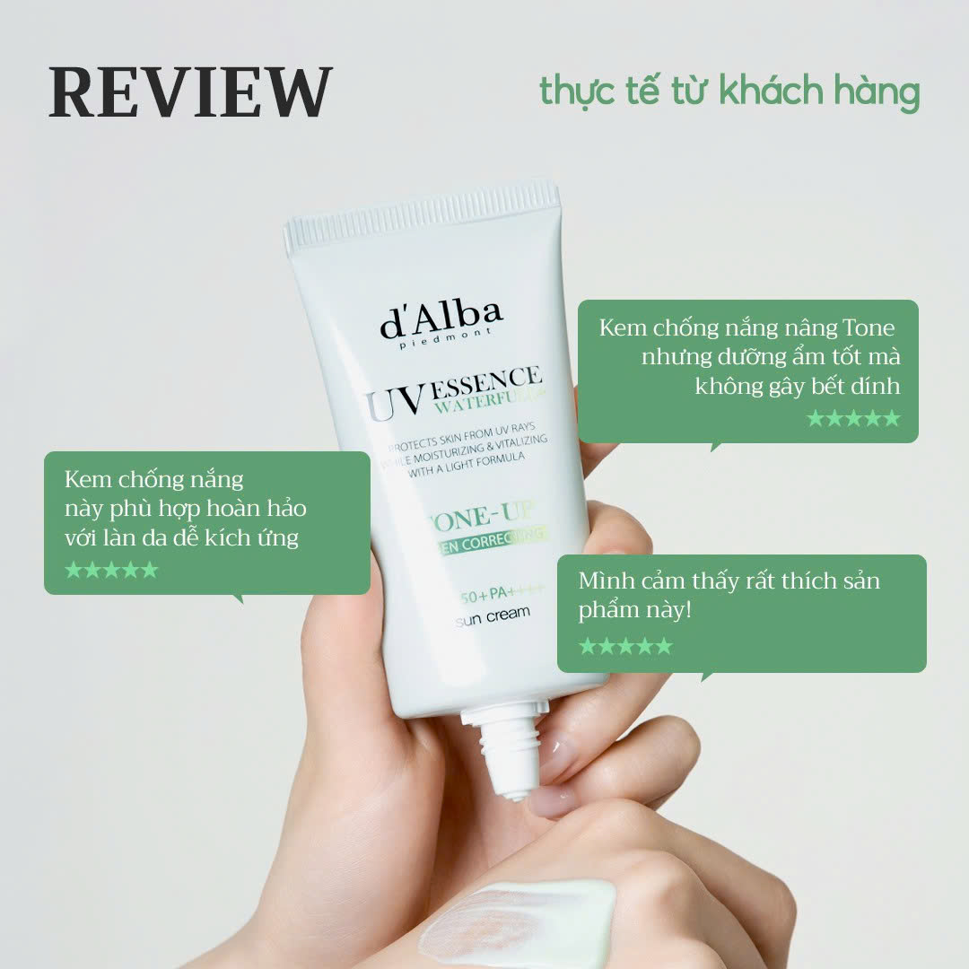 - Green là phiên bản kem chống nắng xanh lá mới nhất 2025 bổ sung vào line chống nắng nhà d’Alba, tích hợp 03 chức năng gồm chống tia UV toàn diện, ngăn ngừa nếp nhăn cải thiện các dấu hiệu lão hóa và làm sáng da với thành phần TROPHEROL™™ được cấp bằng sáng chế của Dalba Reader.