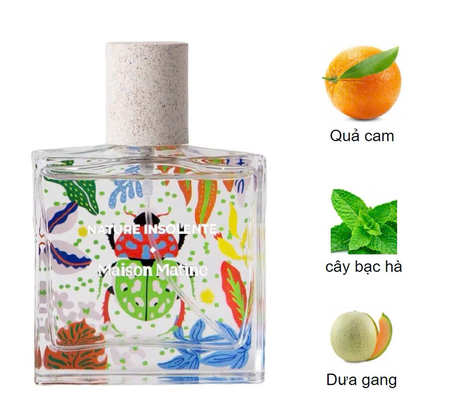 Maison Matine Nature Insolente là một loại nước hoa mới ra mắt vào năm 2021, mang hương Citrus Cam Chanh tươi mát. Là một hương thơm unisex đặc trưng của hãng Maison Matine nên phù hợp cho cả phụ nữ và nam giới. Mùi hương này được tạo ra bởi Philippine Courtière. Tươi mới, dịu mát và ngập tràn sự sống là những điểm đặc biệt của Nature Insolente. Mỗi nốt hương trong chai nước hoa này được ví như hơi thở dễ chịu của thiên nhiên.