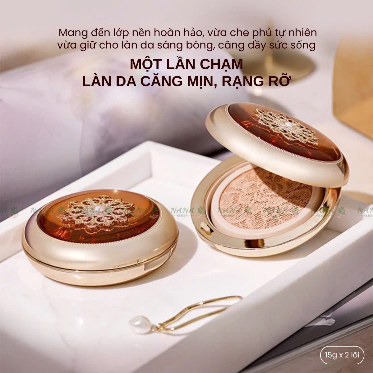 Dòng Radiant Essence Cushion chứa các thành phần tinh túy từ Hoàng cung và các hoạt chất dưỡng da cao cấp. Những thành phần này không chỉ giúp trang điểm. Chúng còn nuôi dưỡng da khỏe mạnh, chống lại quá trình lão hóa.
