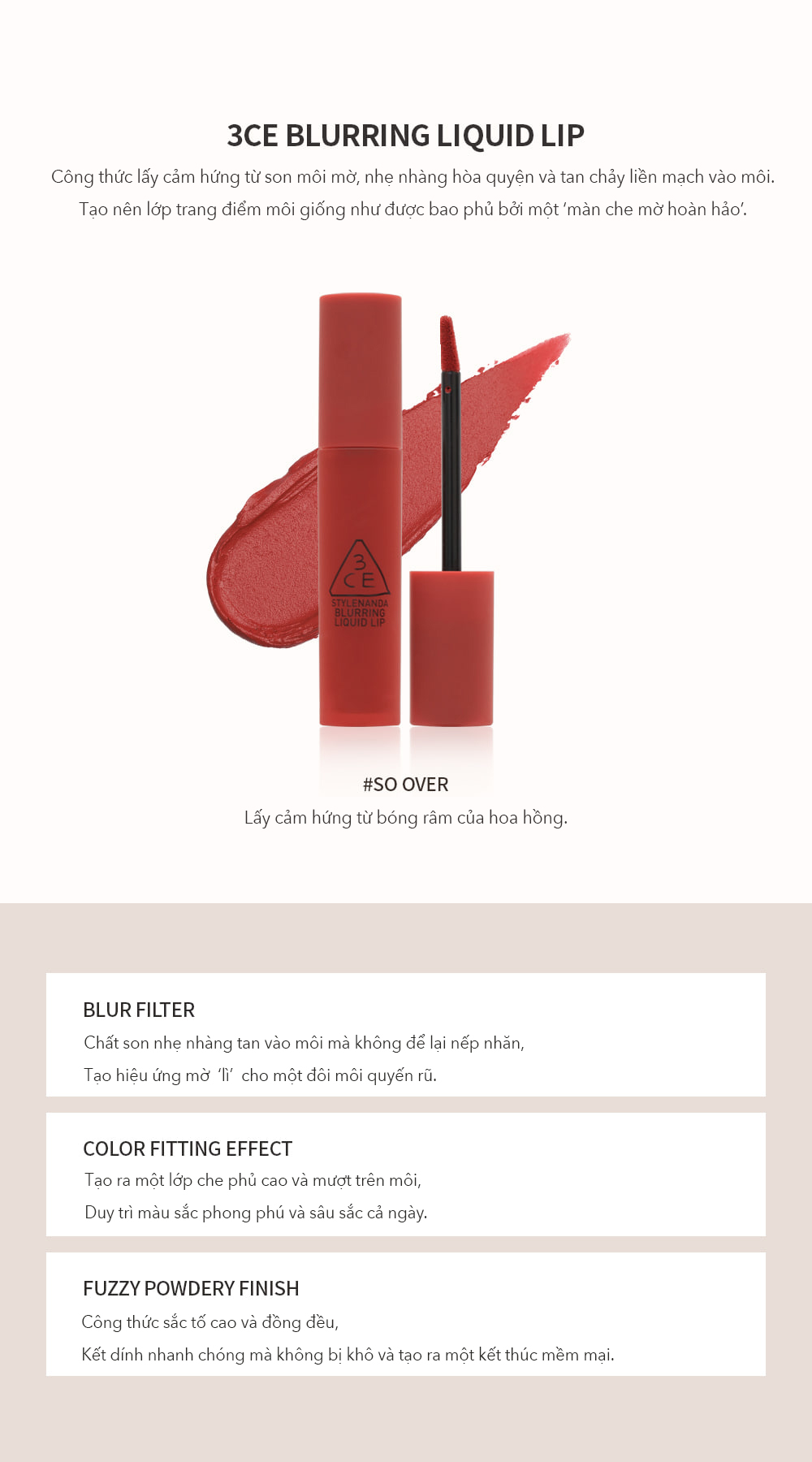 So Over là màu hoa hồng rực rỡ có pha với một chút sắc đỏ. Đây là một màu son lãng mạn, rực rỡ và sống động. 3CE So Over là màu son lý tưởng dành cho những bạn yêu thích những tông son rực rỡ, sống động và lãng mạn. Một lưu ý quan trọng, 3CE Blurring Liquid Lip là màu son được pha trộn từ nhiều sắc với nhau. Do đó, tùy vào màu nền môi, sắc son sẽ thể hiện mức độ khác nhau.