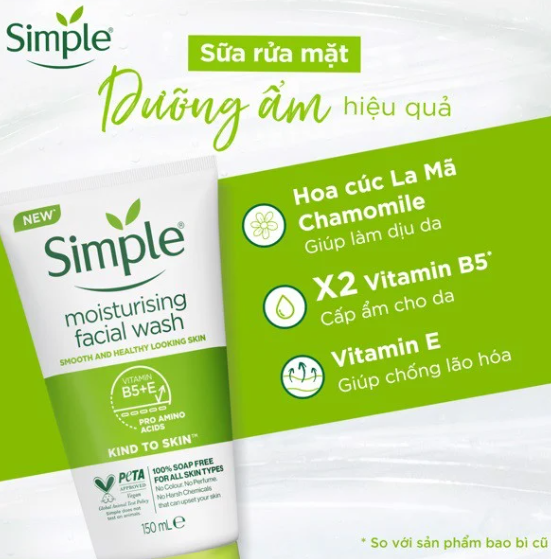 Sữa Rửa Mặt Cho Da Khô Simple Kind To Skin Moisturising 150ml là sữa rửa mặt chứa cac thành phần chính như pro-vitamin B5, vitamin E và Bisabolol giúp làm sạch nhờn, bụi bẩn và các tạp chất khác mà không làm khô da hay mất nước mang lại làn da sạch thoáng, sảng khoái thuộc thương hiệu Simple đến từ Anh.