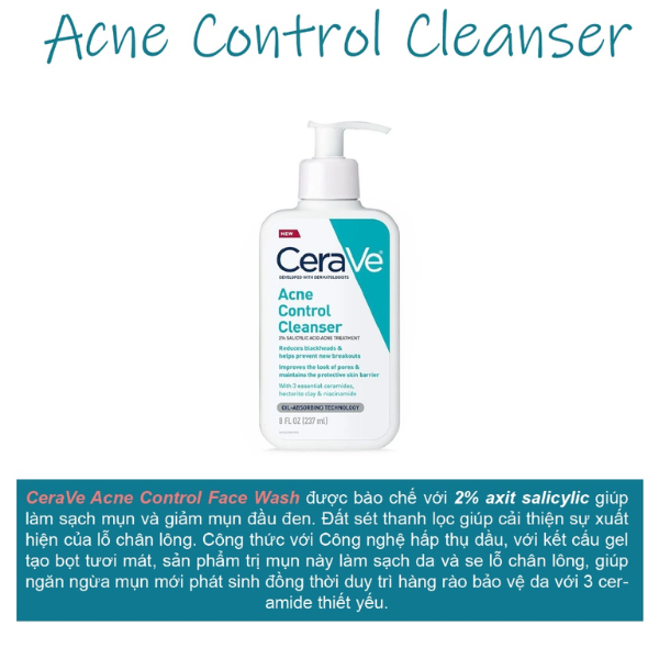 Mụn trứng cá có thể ảnh hưởng đến thanh thiếu niên và người lớn, và một loại sữa rửa mặt trị mụn hiệu quả là một bước thiết yếu trong bất kỳ chế độ chăm sóc da trị mụn nào. CeraVe Acne control lý tưởng để sử dụng hàng ngày để nhẹ nhàng tẩy tế bào da chết có thể làm tắc nghẽn lỗ chân lông và góp phần gây ra mụn trứng cá, sữa rửa mặt có axit salicylic mang lại lợi ích kiểm soát mụn trứng cá và có thể bổ sung cho các phương pháp điều trị mụn trứng cá không kê đơn và không kê đơn khác để giúp duy trì làn da sạch, làn da khỏe mạnh.