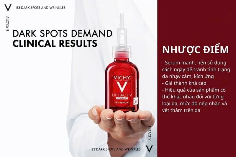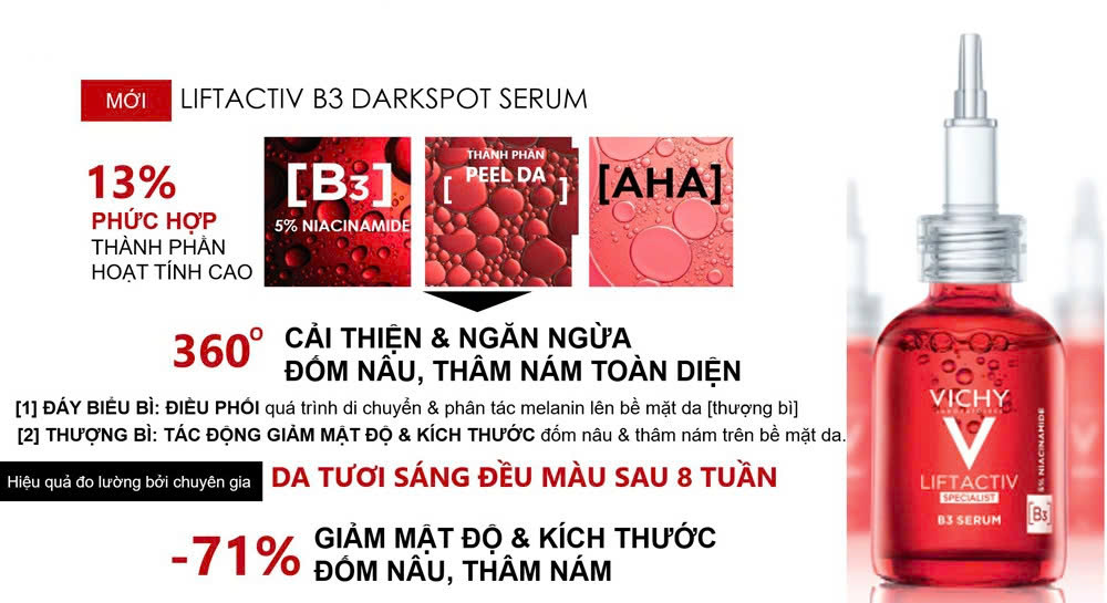 Serum Vichy LiftActiv B3 Serum Dark Spots & Wrinkles là dòng serum đến từ thương hiệu mỹ phẩm Vichy được đánh giá rất cao từ giới chuyên gia cũng như người dùng bởi công dụng dưỡng ẩm chuyên sâu và giúp làn da cải thiện rõ rệt tình trạng thâm nám, đốm nâu.